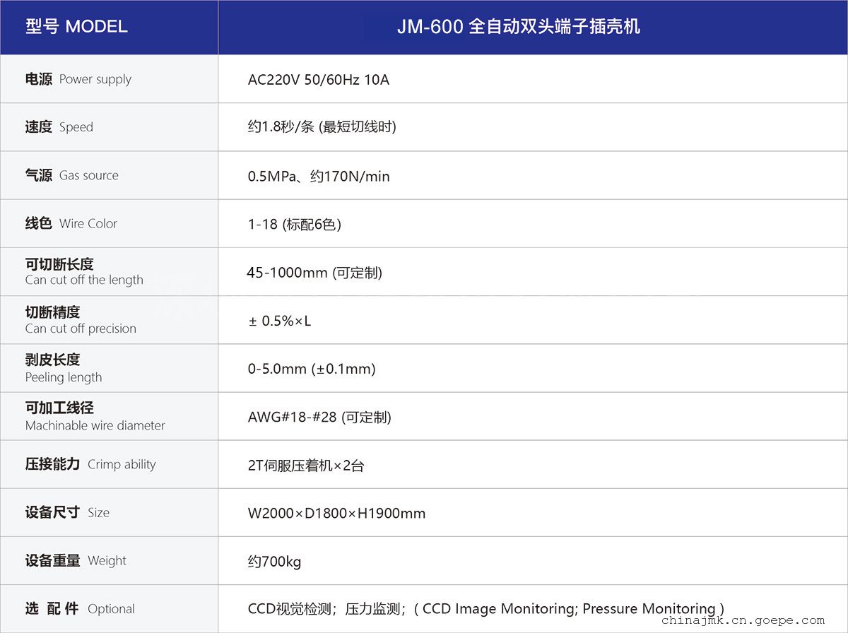 品牌:日精智能 加工定制:是 型号:JM-600 工作电压:220 V 外形尺寸:W20008*D1800*H1900 mm 重量:700 kg JM-600 全自动双头端子插壳机